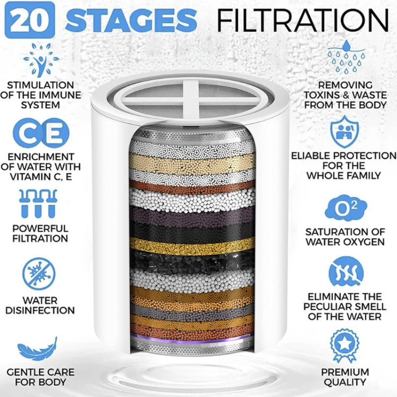 Innovativt 20-trinns filtreringssystem bestående av ioniske mineralsteiner, ABS (akrylnitrilbutadienstyren), PP-bomull, vitamin C, KDF 55 og mer for å mykgjøre hardt vann og fjerne uønskede elementer som klor, bakterier, smuss og rust.